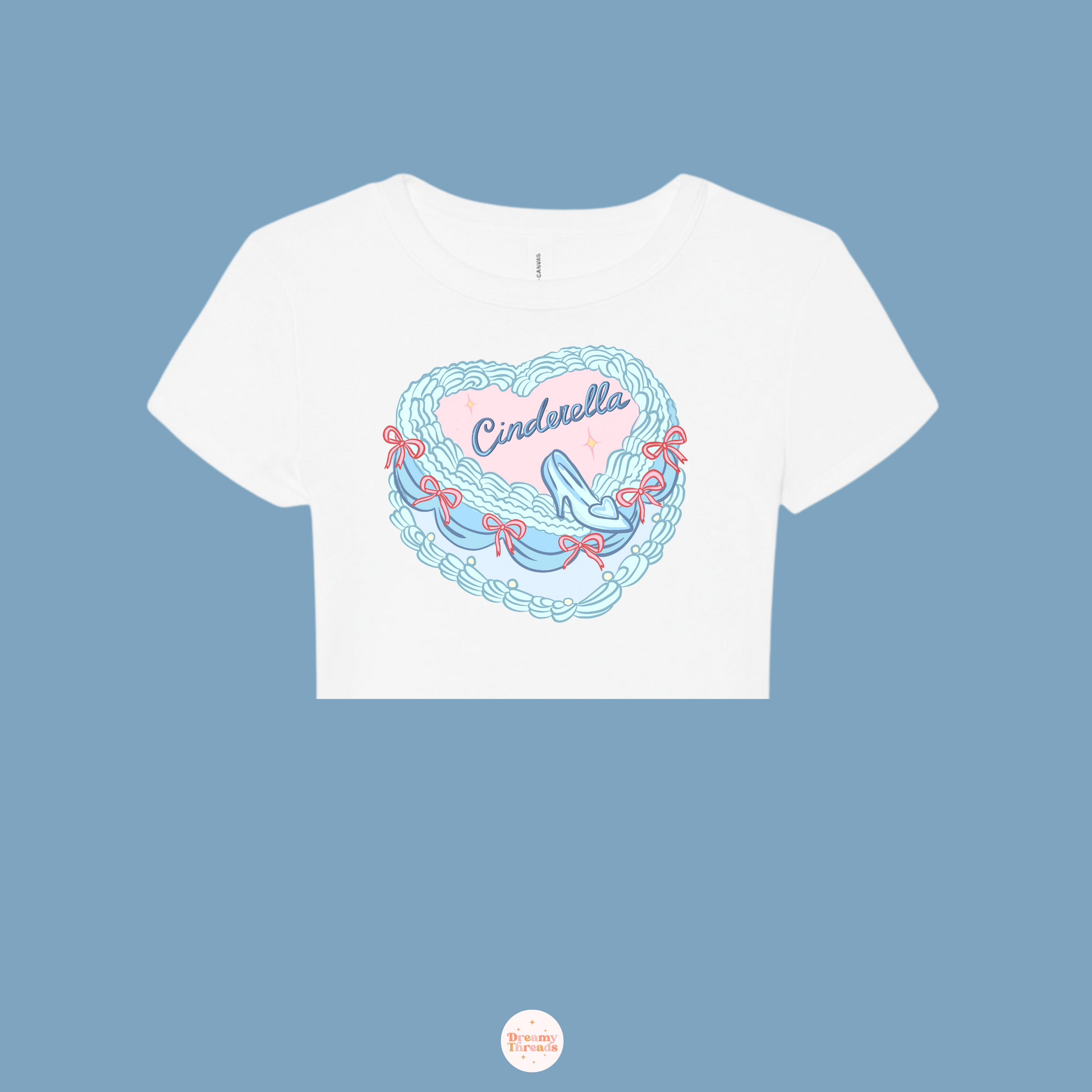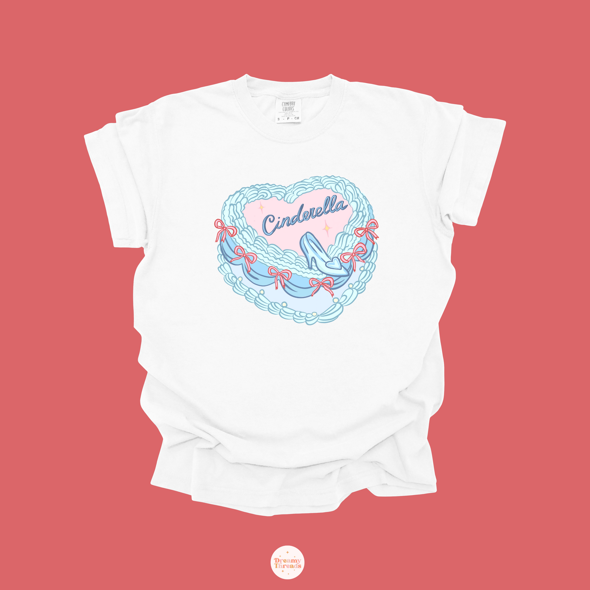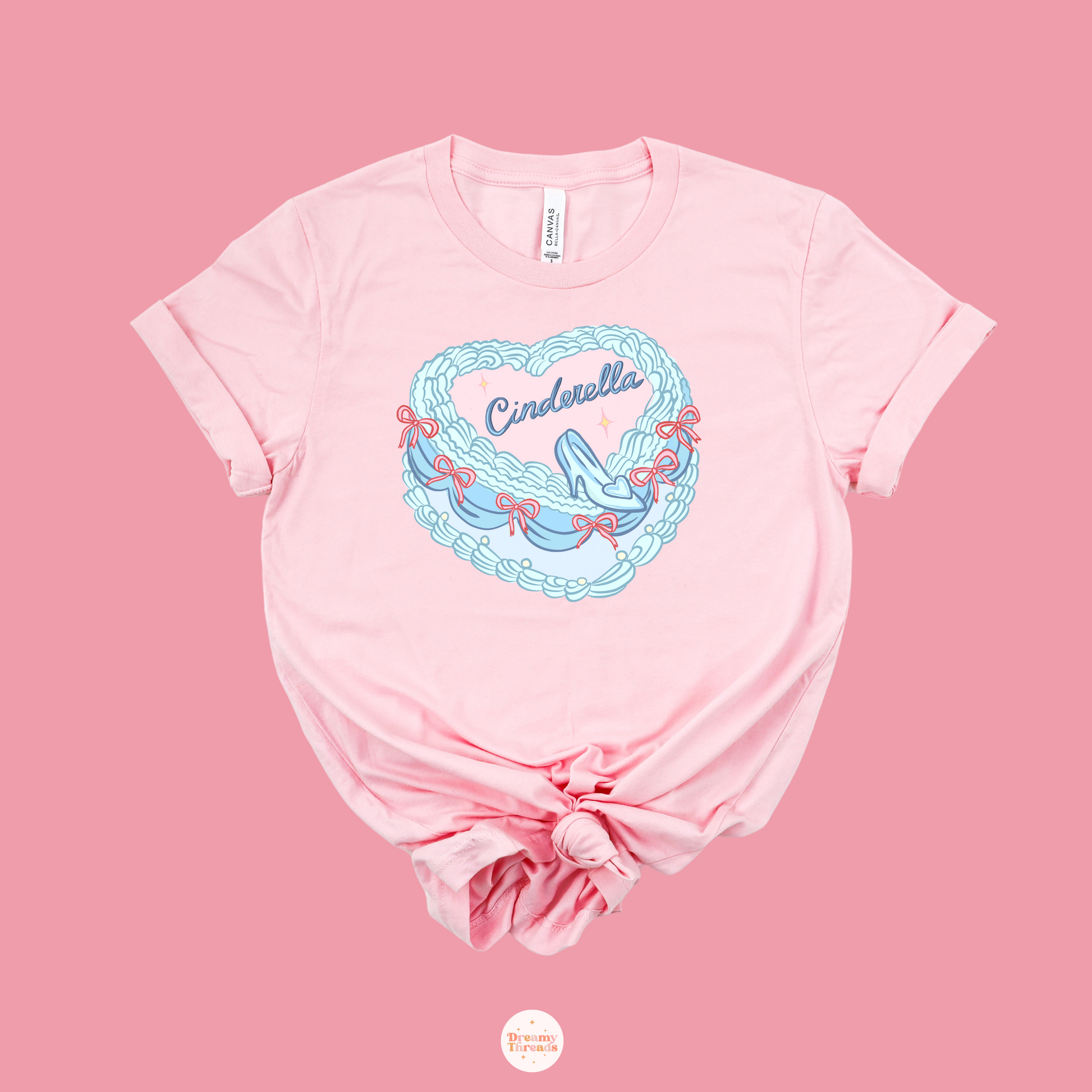 Add a little magic to your wardrobe with our Cinderella Princess Cake Tee! This dreamy design features a pastel blue heart-shaped cake decorated with dainty bows and Cinderella’s iconic glass slipper—finished with her name in a fairytale script.