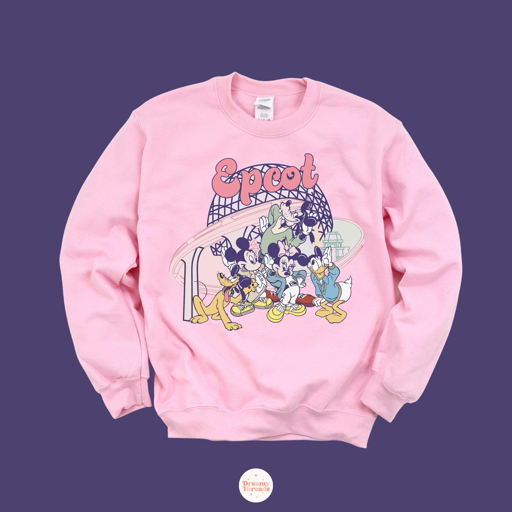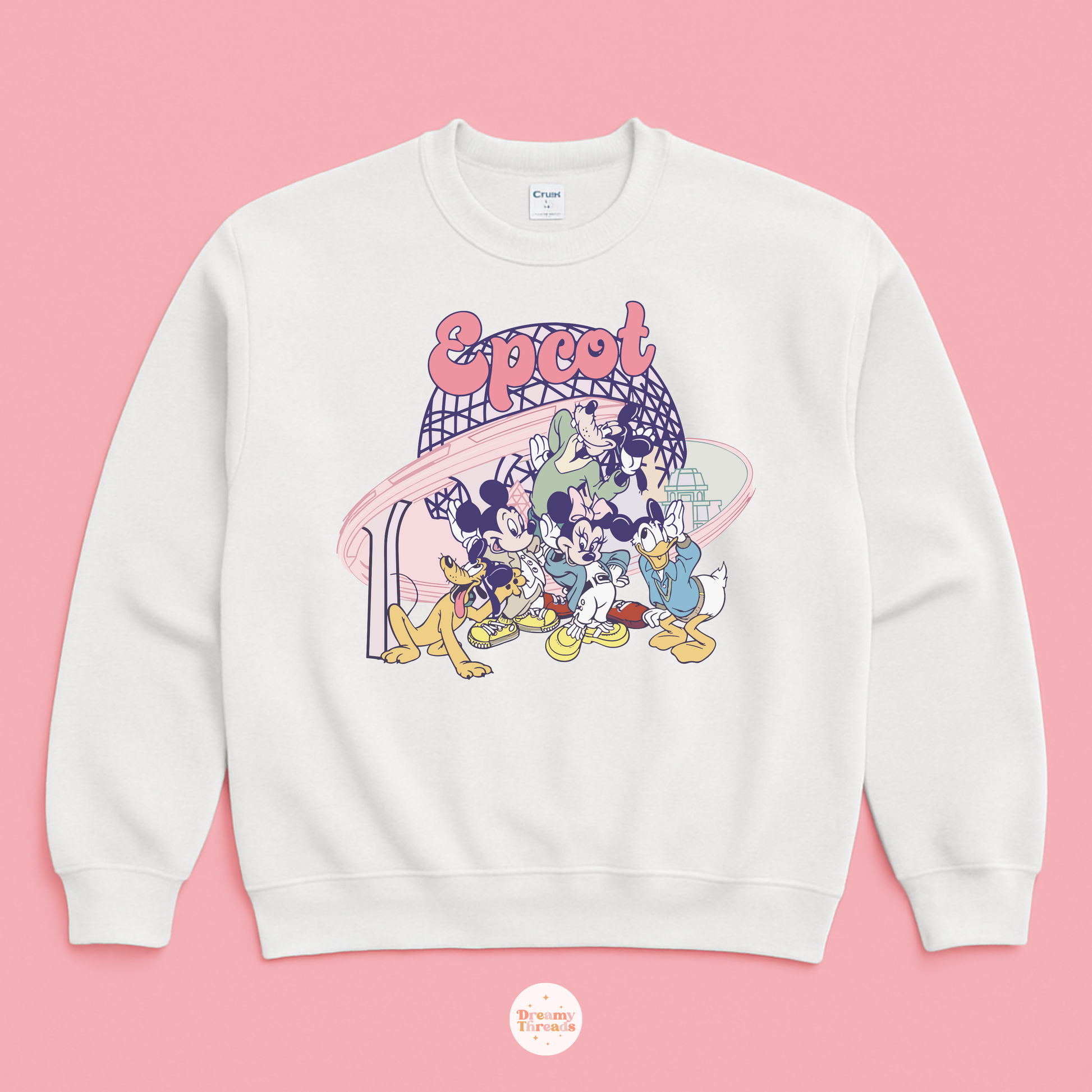 Show off your love for Epcot and all your favorite Disney characters with this whimsical and colorful fleece-lined crewneck! Featuring the iconic Epcot ball in the center surrounded by all your beloved Disney friends, this is sure to bring a smile to anyone's face. Available in sizes from baby to 3XL adult, and in three fun and feminine colors - pink, white, and purple - this crew is perfect for fans of all ages. Whether you're strolling around the park or just dreaming of your next Disney adventure, this is a must-have for any Disney lover. Get yours today and add a touch of magic to your wardrobe!