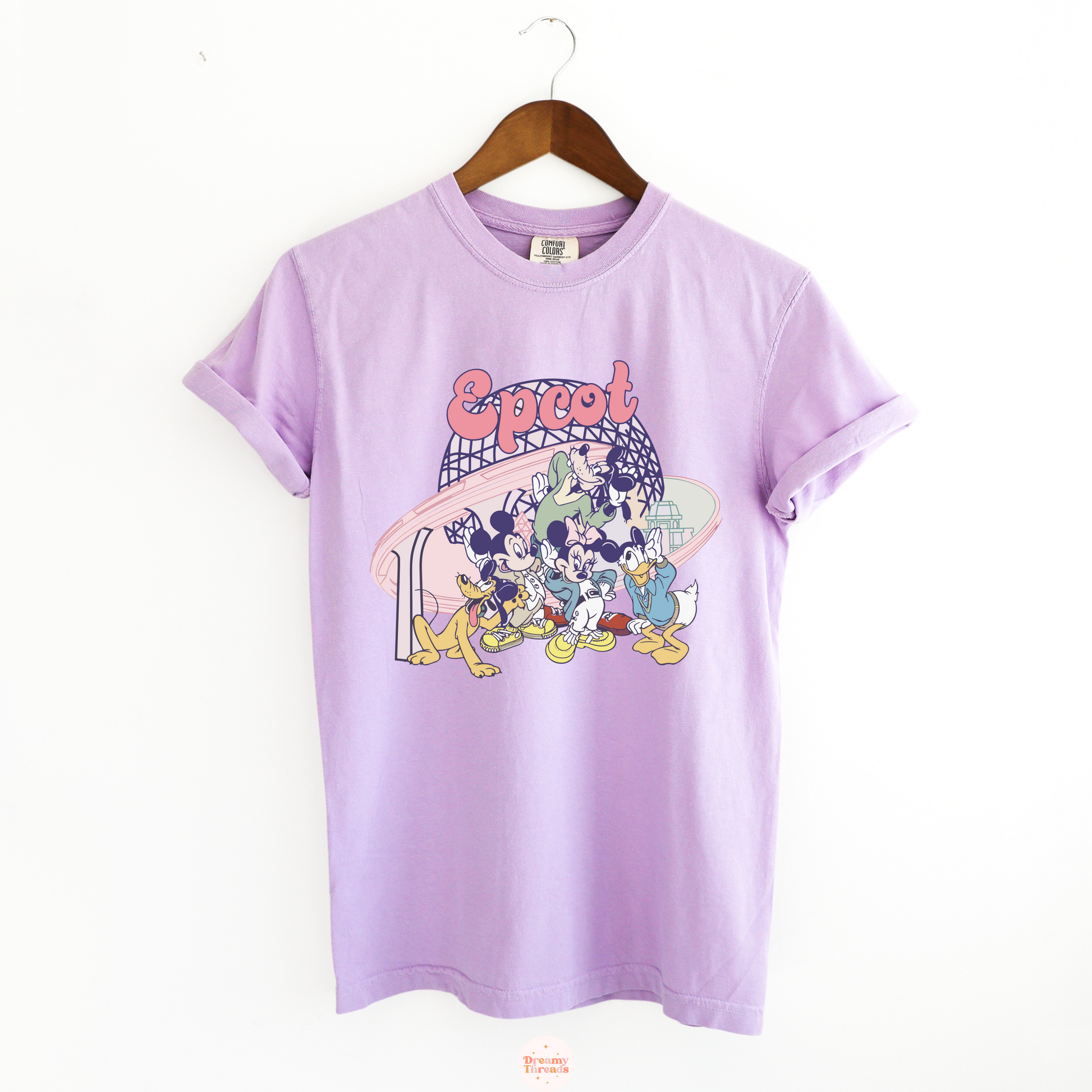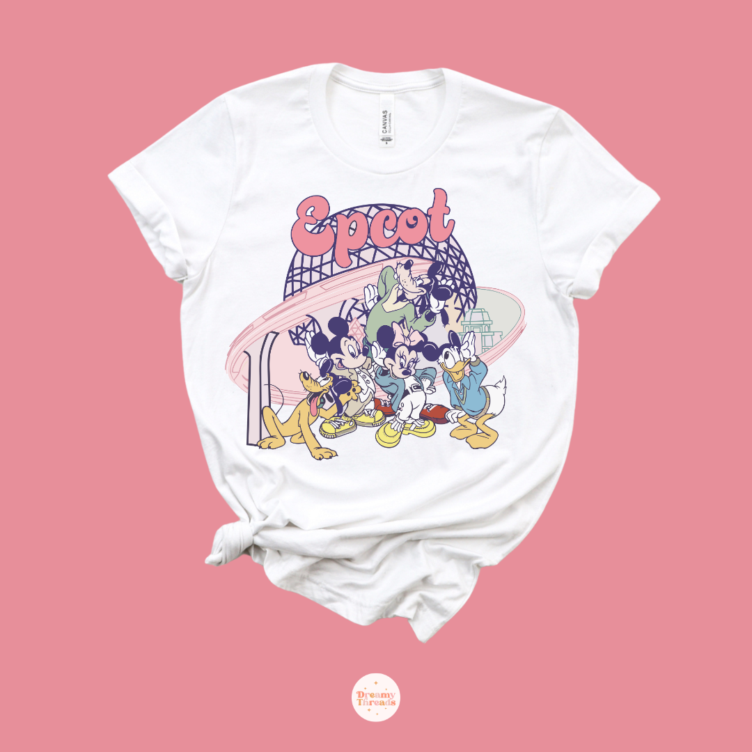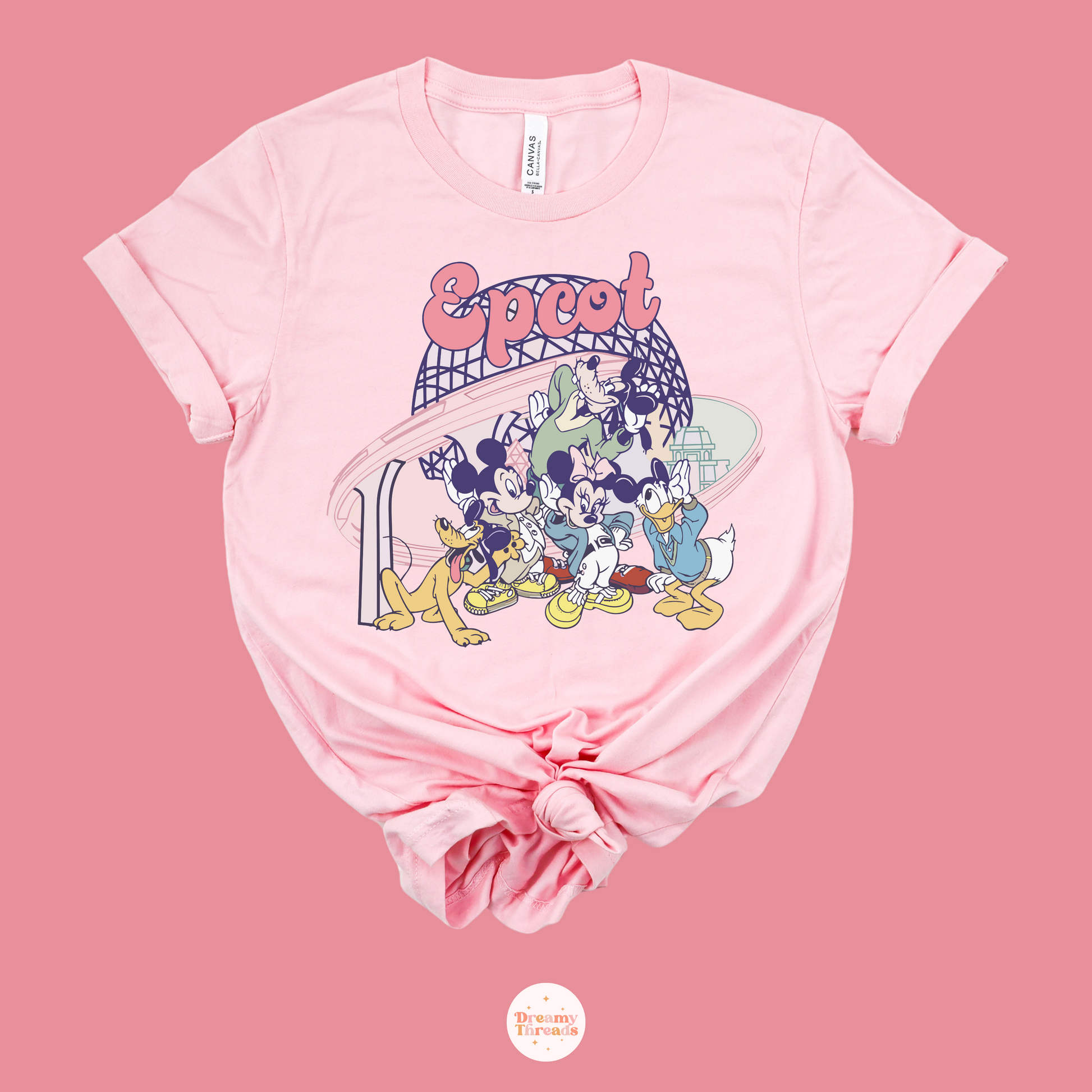 Show off your love for Epcot and all your favorite Disney characters with this whimsical and colorful t-shirt! Featuring the iconic Epcot ball in the center surrounded by all your beloved Disney friends, this shirt is sure to bring a smile to anyone's face. Available in sizes from baby to 3XL adult, and in two fun and feminine colors - pink, white, and purple - this shirt is perfect for fans of all ages. Whether you're strolling around the park or just dreaming of your next Disney adventure, this shirt is a must-have for any Disney lover. Get yours today and add a touch of magic to your wardrobe!
