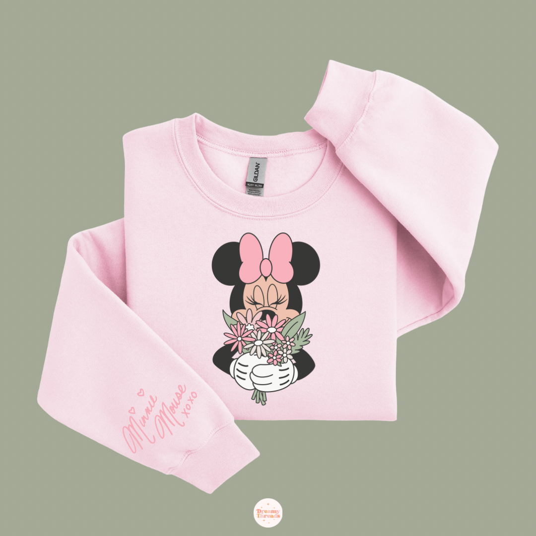 Wrap yourself in sweetness with our Minnie Bouquet Sweatshirt! Featuring an adorable design of Minnie Mouse holding a pink floral bouquet, this cozy crewneck is perfect for Disney lovers with a soft spot for girly, romantic vibes.