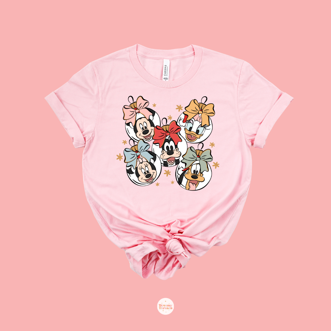 Our Cheerful Ornaments Tee/Crew is a must-have for Disney fans of all ages. Featuring all your favorite characters like Minnie, Mickey, Pluto, Daisy, Goofy, and Pluto, this design is available in pink, white, and beige in both t-shirt and crewneck styles. From babies to adults, spread the joy of Disney with this versatile and playful design.