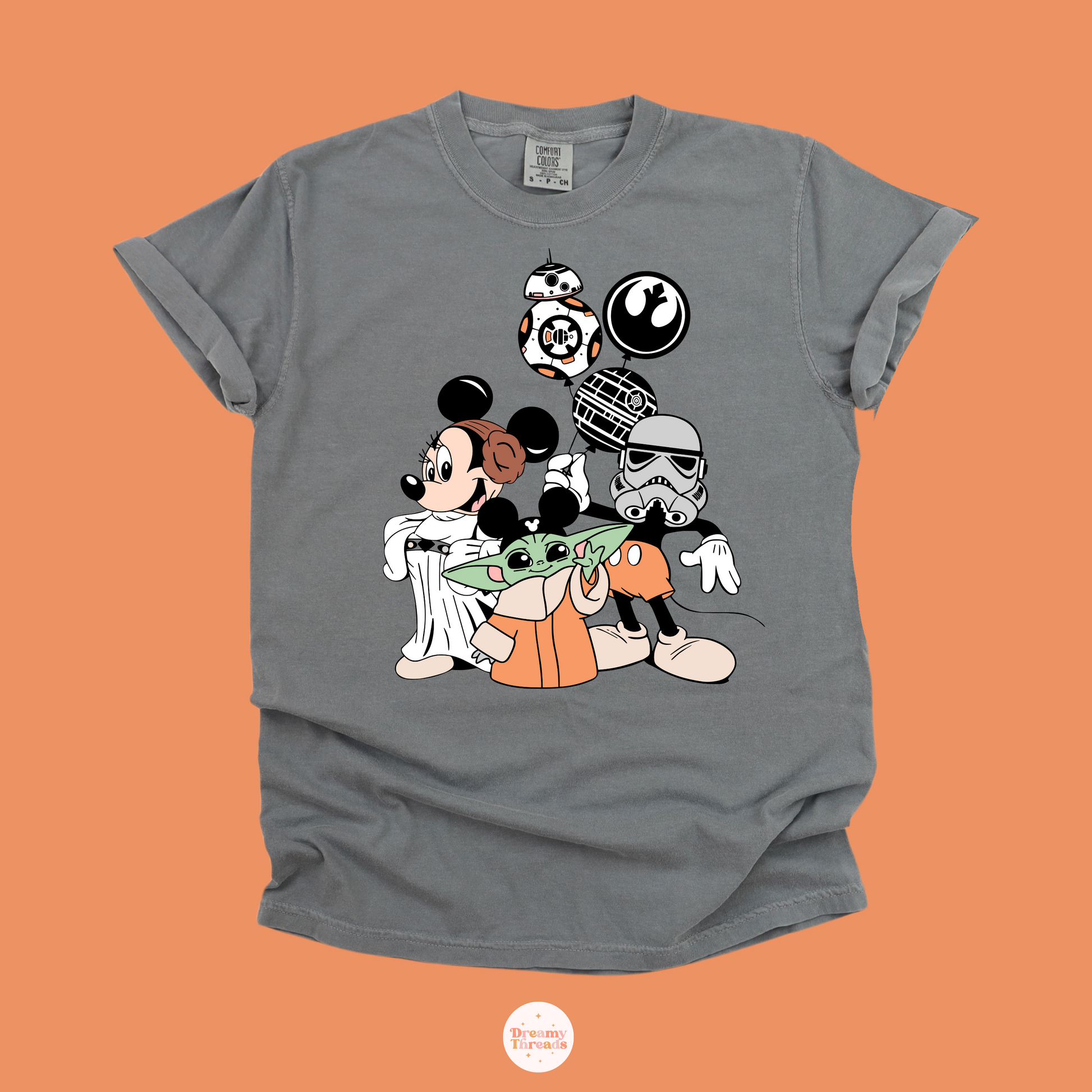 Enjoy the ultimate galactic fandom with our limited edition Space Gray Tee! Featuring Minnie Mouse as Princess Leia, Baby Yoda as Mickey, and Mickey as a Stormtrooper, this tee is perfect for Star Wars lovers of all ages. Available in three colors and sizes from baby to adult. Allow 5-7 business days for production. If needed sooner, please message us on instagram @dreamythreads.