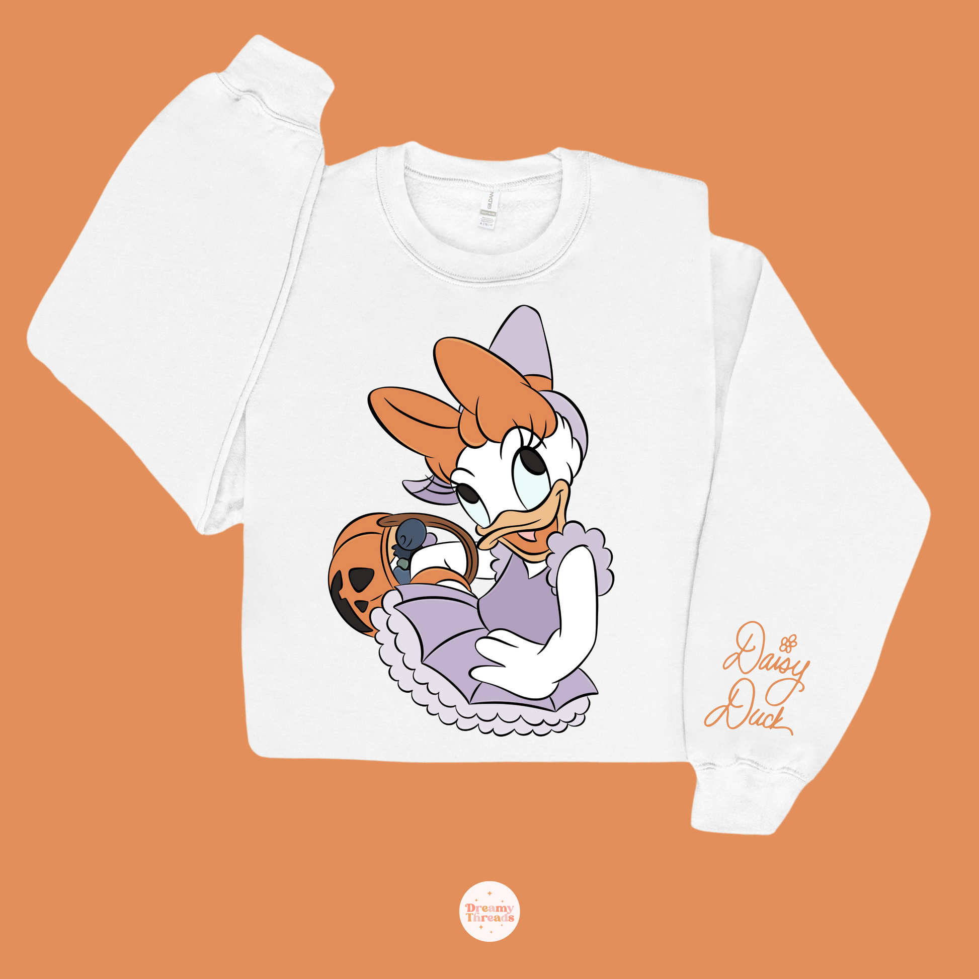 Indulge in Halloween magic with this delightful Dreamy Threads sweatshirt starring Daisy Duck. Dressed in a lavender dress and matching bow, Daisy hugs an orange jack‑o’‑lantern purse decorated with cute heart‑shaped cutouts. Her autograph is printed on the sleeve in a playful orange script, adding a special signature touch similar to other Dreamy Threads character piecesdreamythreadsco.com.