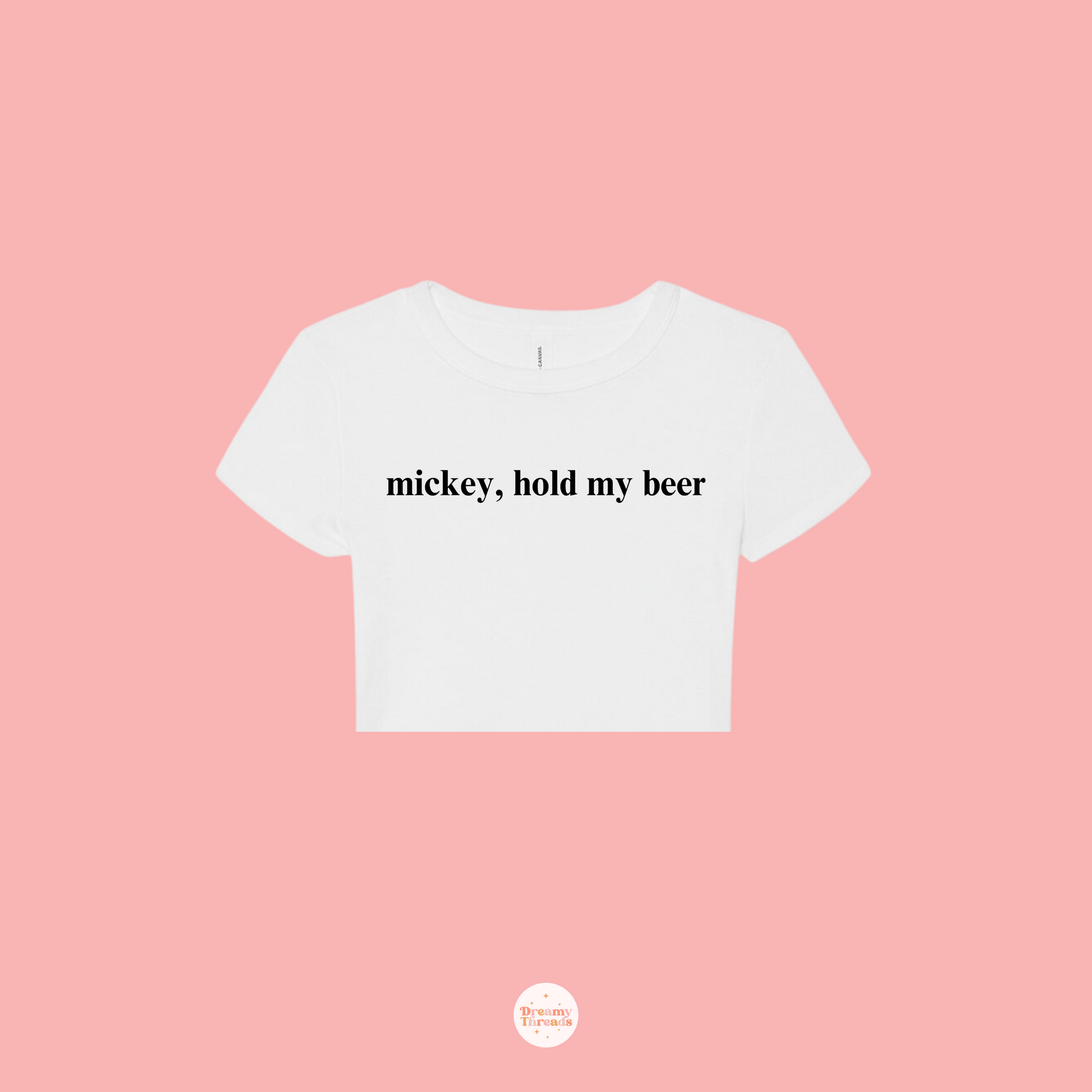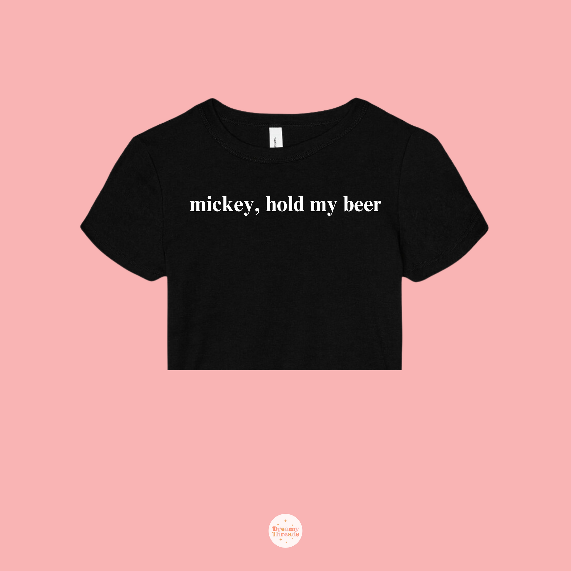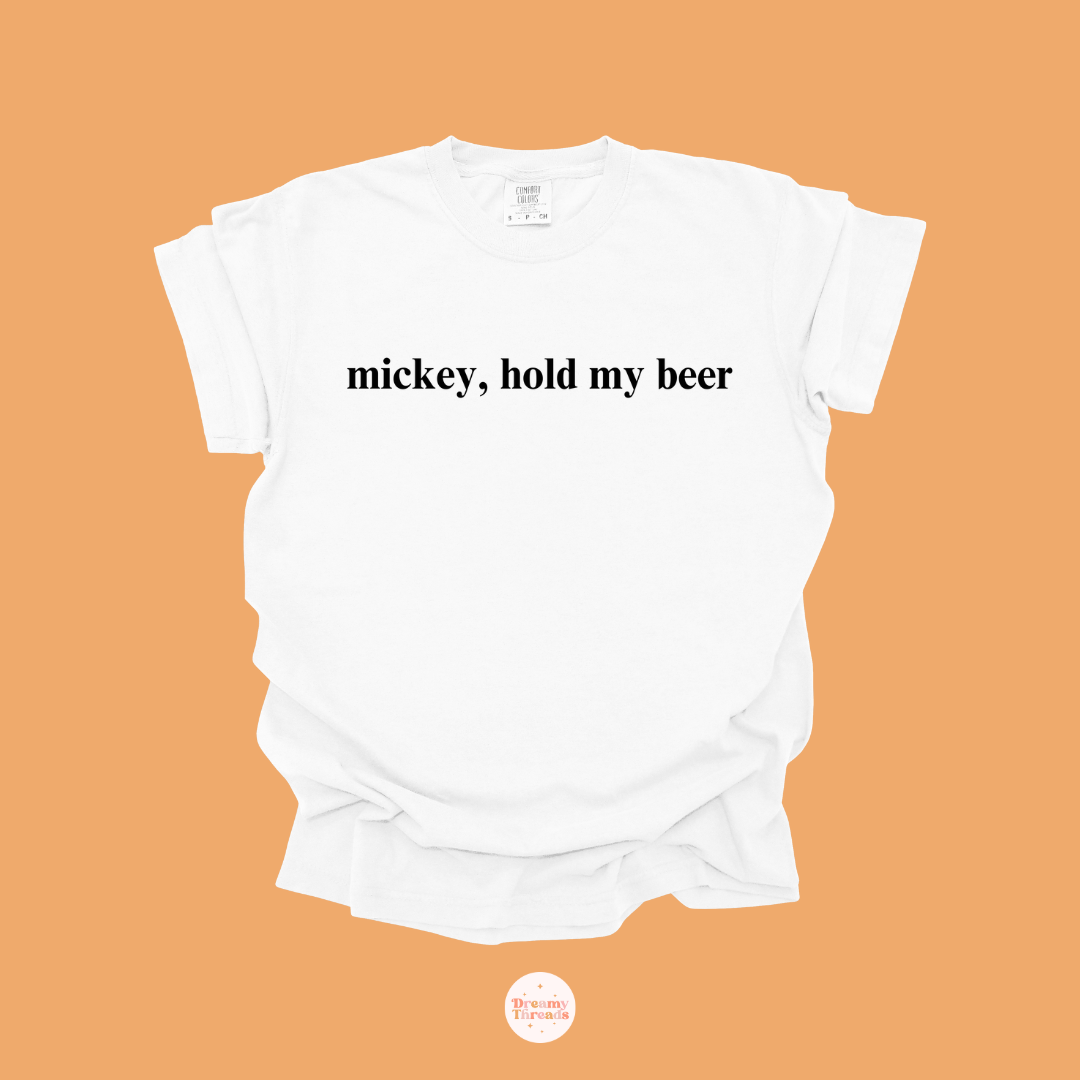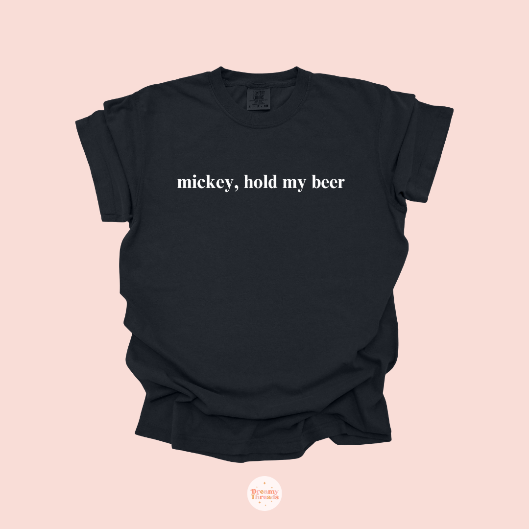 Introducing our latest shirt for Epcot's Food and Wine Festival: the "Mickey Hold My Beer" tee! Available in classic black or white, this shirt comes in two styles: a regular t-shirt or a trendy cropped baby tee for adults. Unlike the usual festival designs, this one is sleek, fun, minimalistic, and perfect for making a statement without the typical cheesy graphics. Ideal for large groups looking to match, if you would like a different color shirt, we can make it happen —message us on Instagram @dreamythreadsco to get it in any color you want!