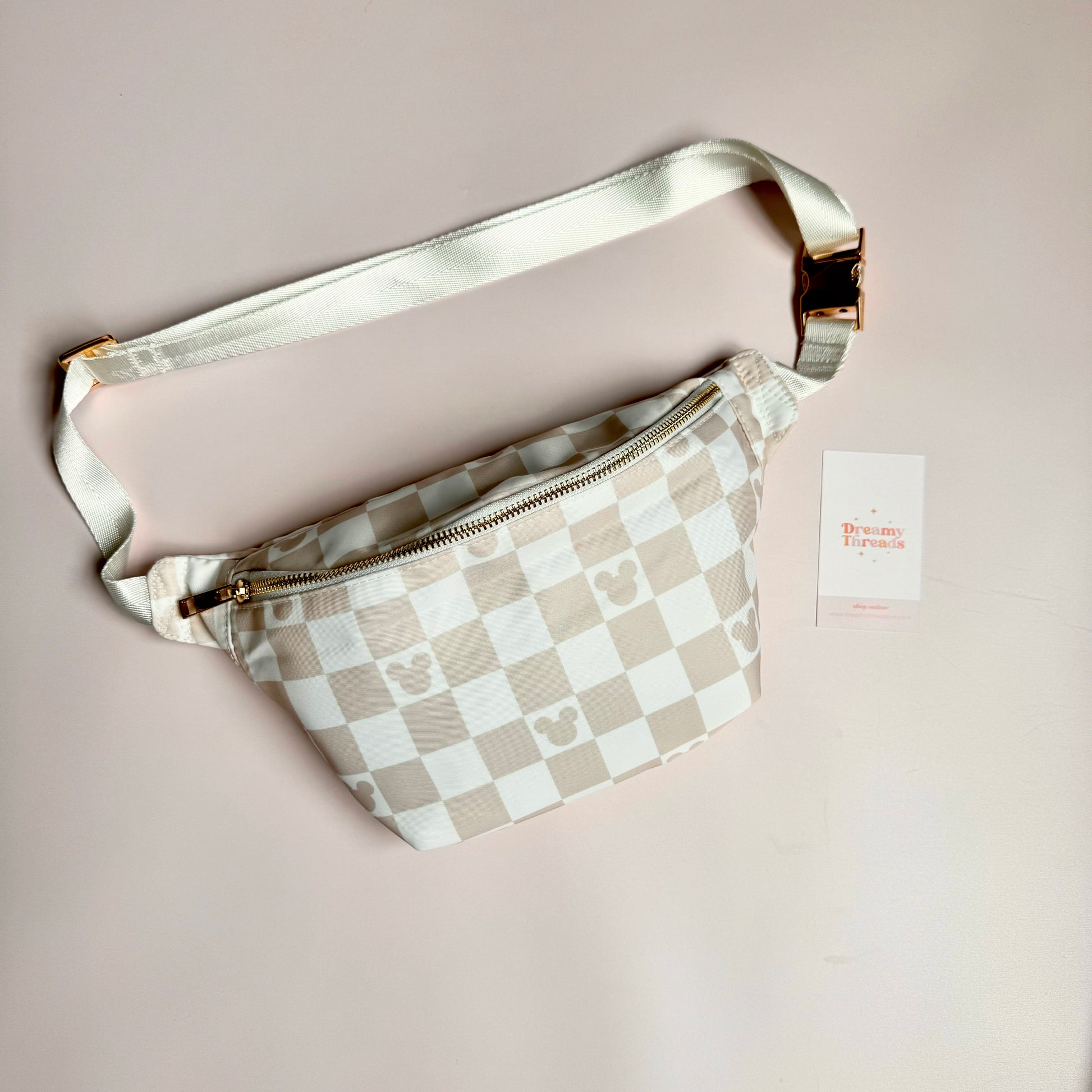 Whether you're heading to the parks or out for a day in the city, our Nude Checkered Mouse Fanny Pack is the perfect blend of functionality and style. Don't miss out on this must-have accessory!