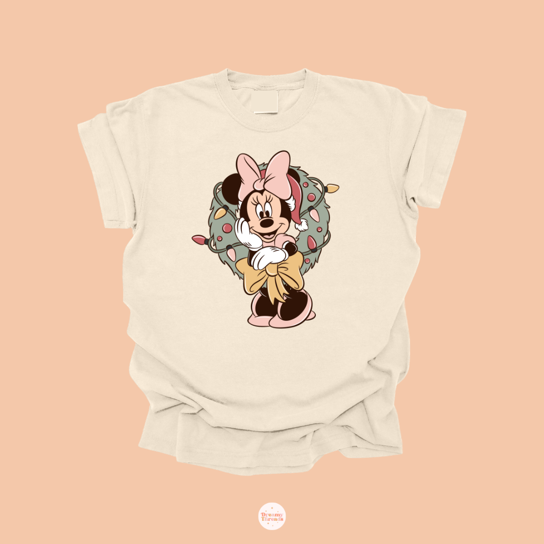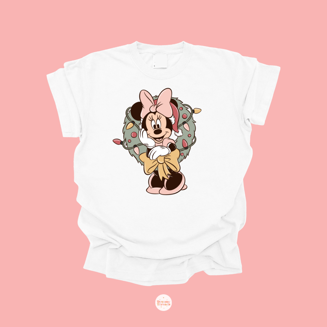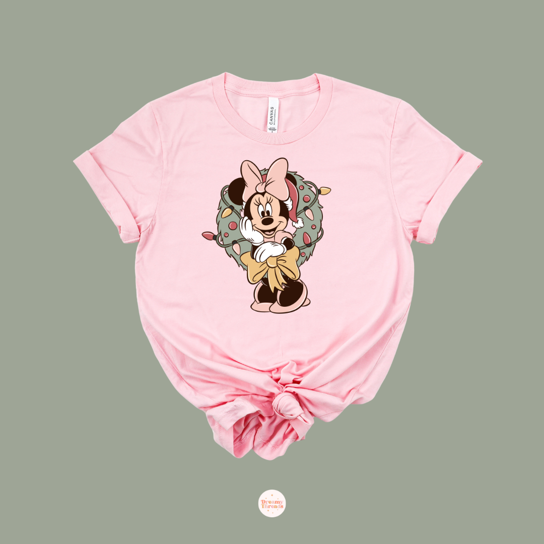 Expertly crafted with a touch of magic, the Magical Wreath Tee/Crew features a charming Minnie Mouse holding a wreath design. Available in a variety of colors in both tee and sweatshirt styles, it's perfect for all ages and occasions. Add a touch of whimsy to your wardrobe today!