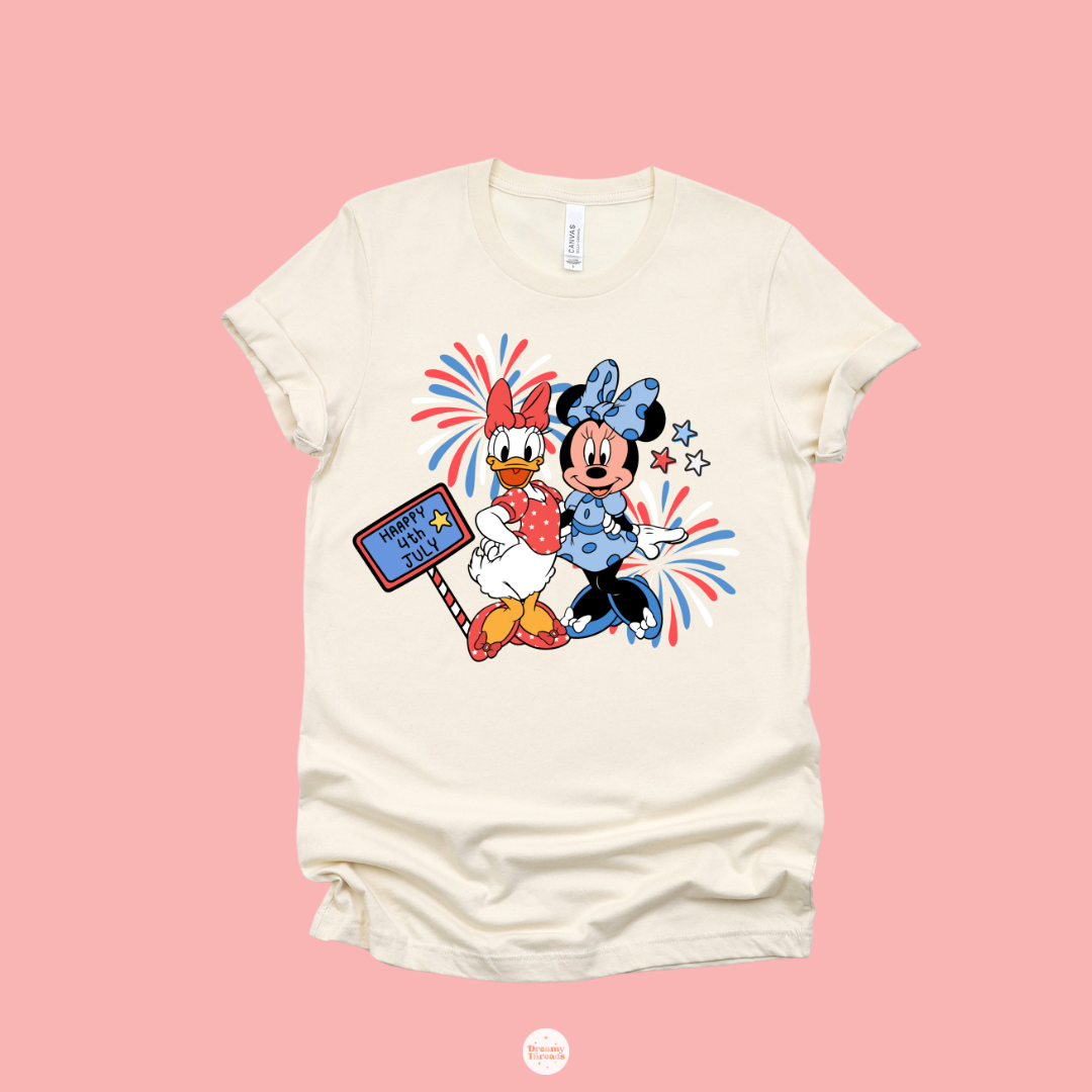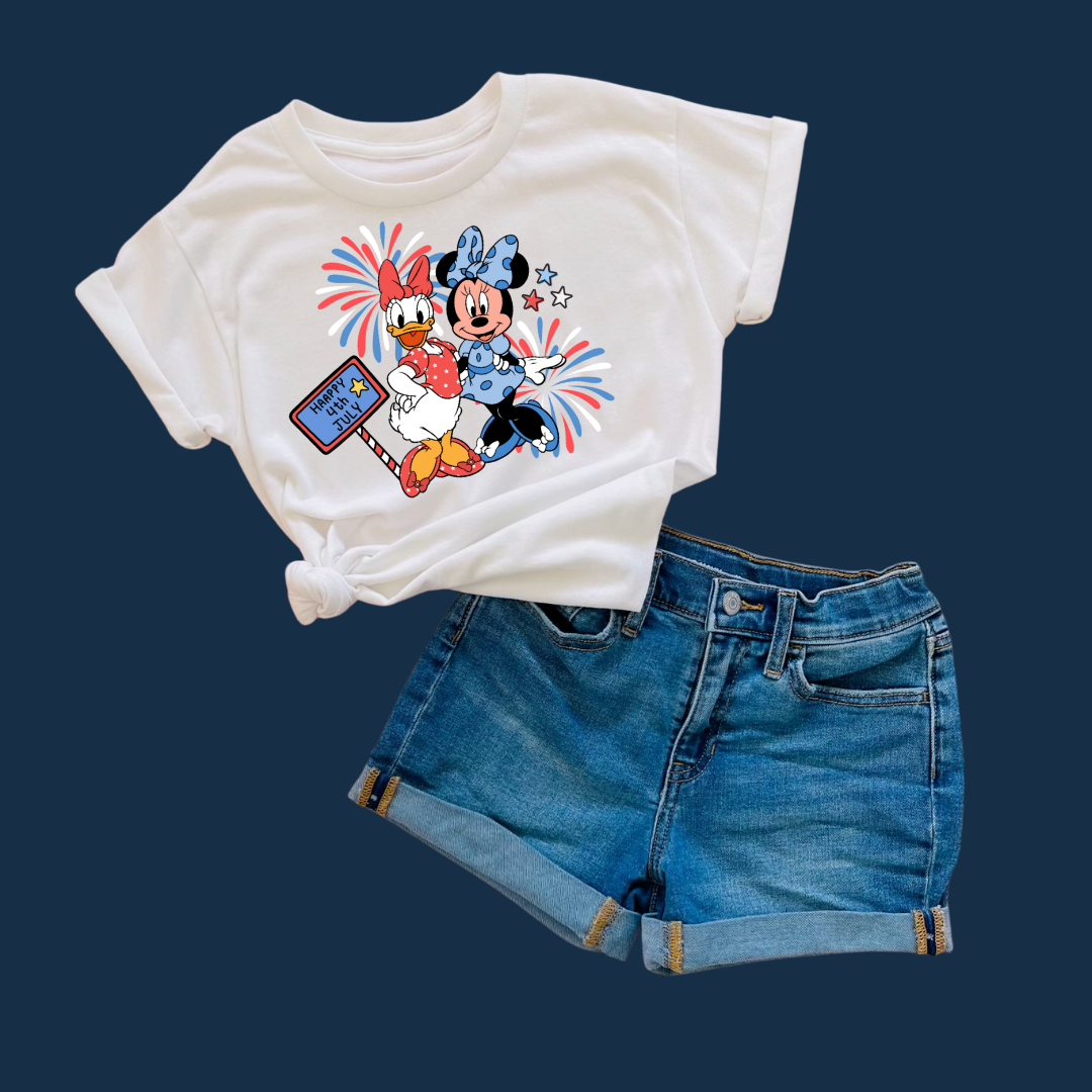 - Design: Adorable Minnie Mouse and Daisy Duck in patriotic attire with fireworks and a "Happy 4th of July" sign