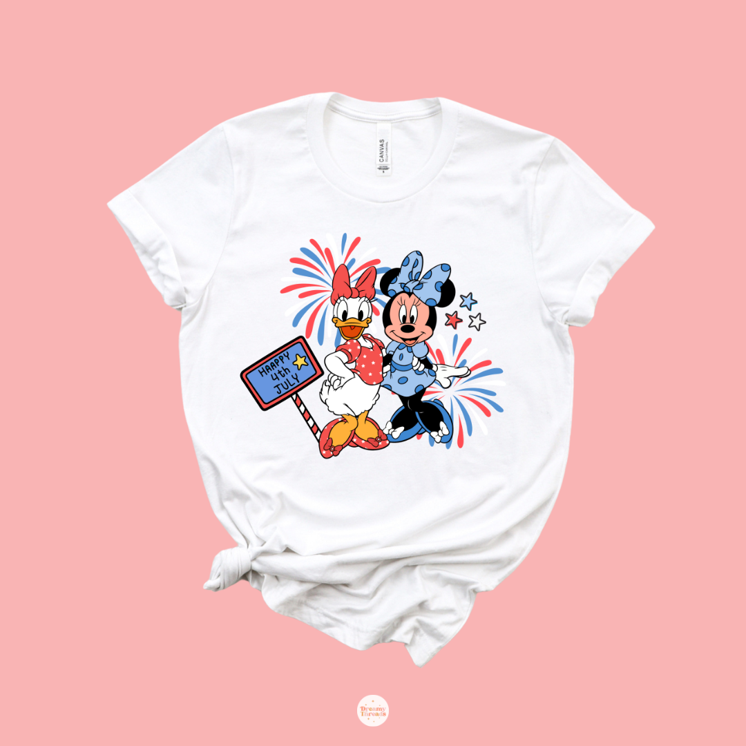 Celebrate Independence Day with Minnie Mouse and Daisy Duck in style! Our 4th of July t-shirt features Minnie and Daisy dressed to impress in their red, white, and blue outfits, surrounded by dazzling fireworks and holding a festive sign that reads "Happy 4th of July." This charming design is perfect for adding a touch of Disney magic to your holiday festivities.