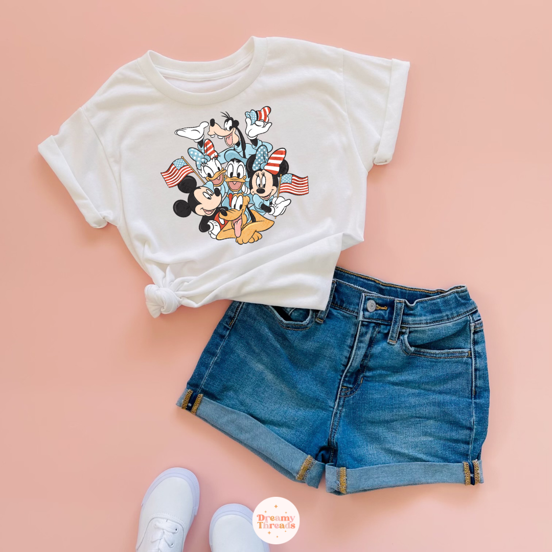 - Design: Adorable illustration of Mickey and the crew holding American flags