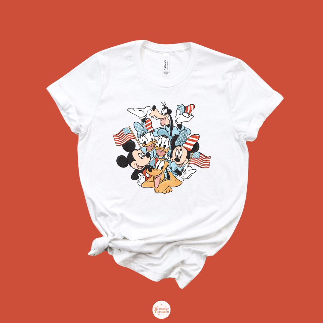 Celebrate Independence Day with a touch of Disney magic! Our 4th of July themed t-shirt features Mickey Mouse and his beloved crew proudly holding American flags. This festive design is perfect for showing off your patriotic spirit in style.
