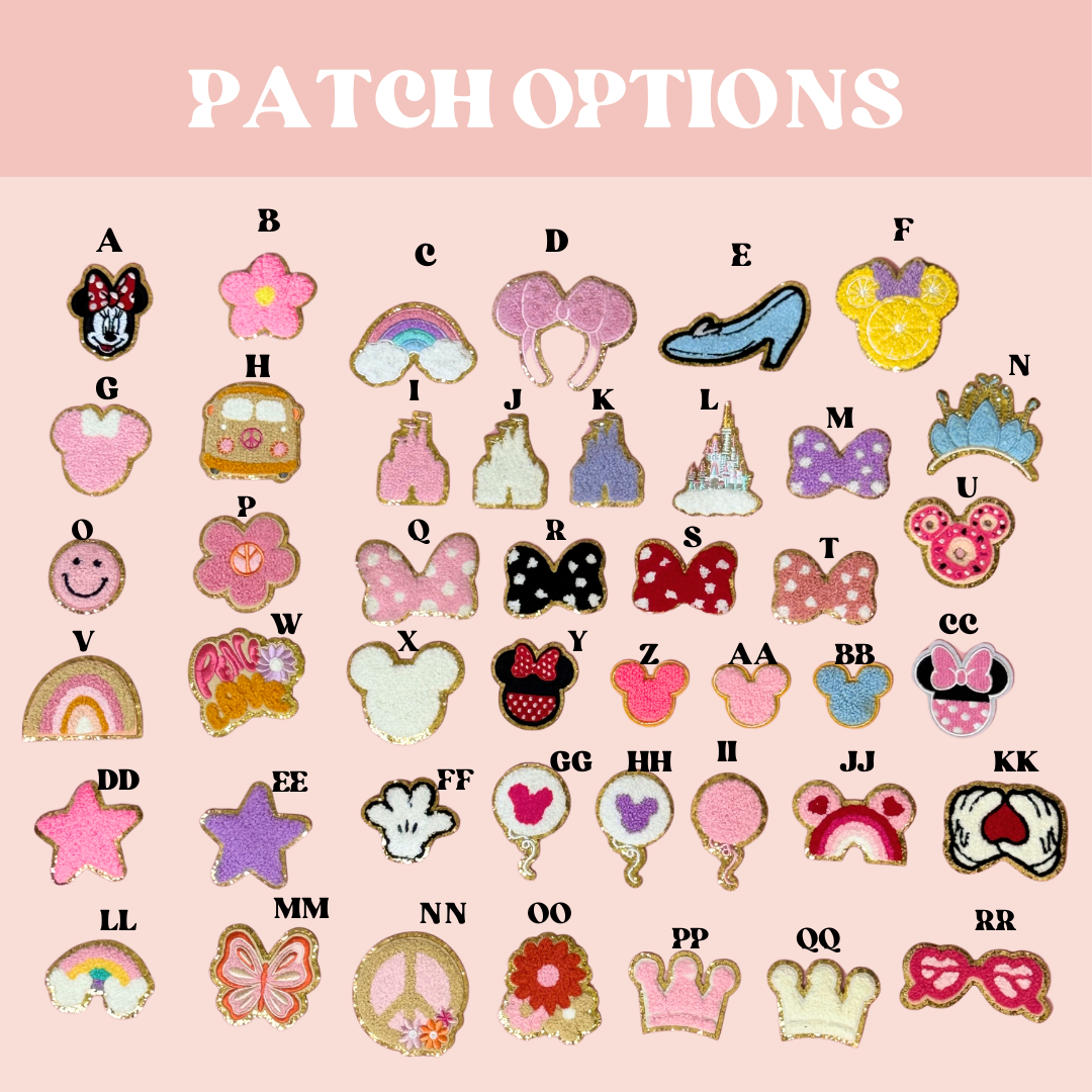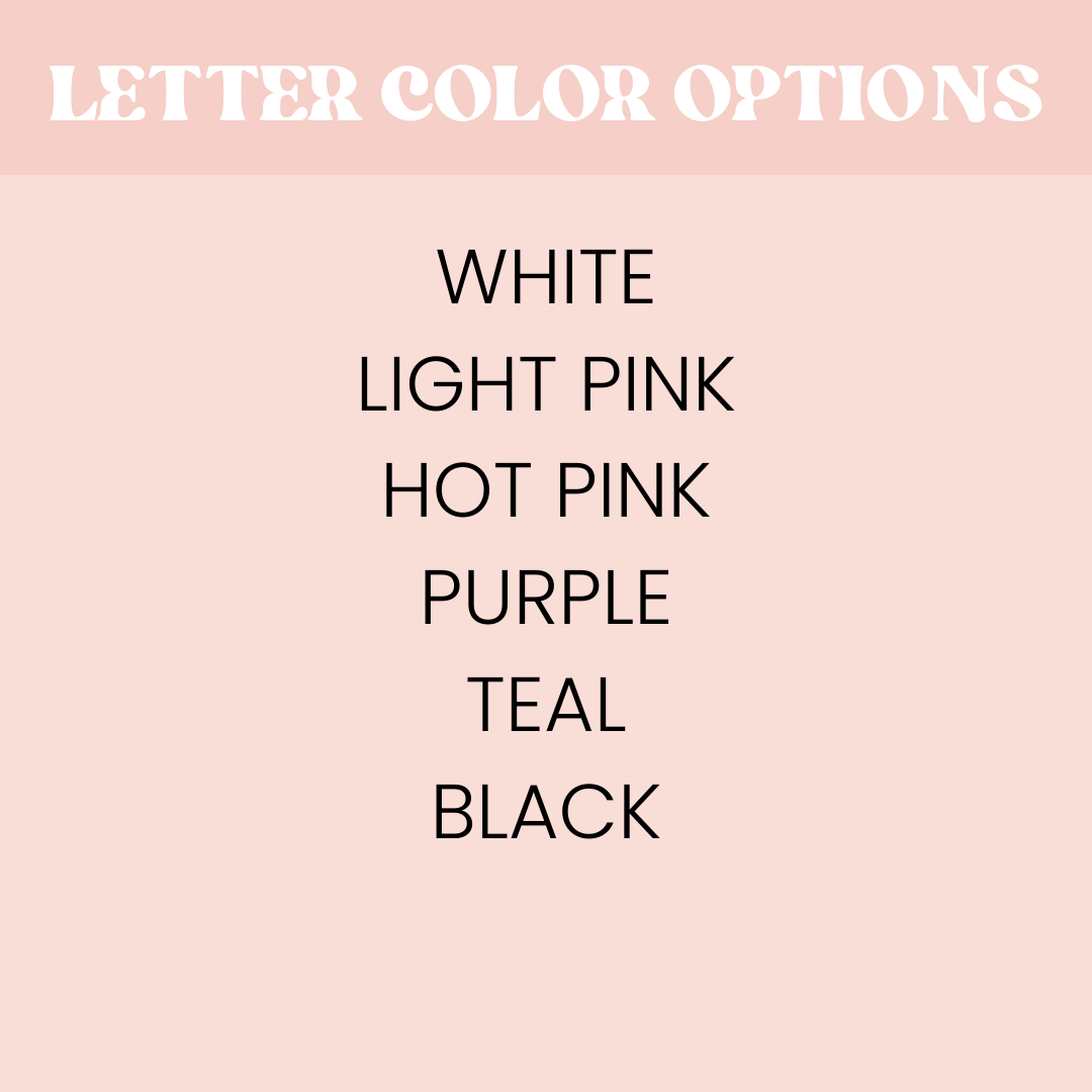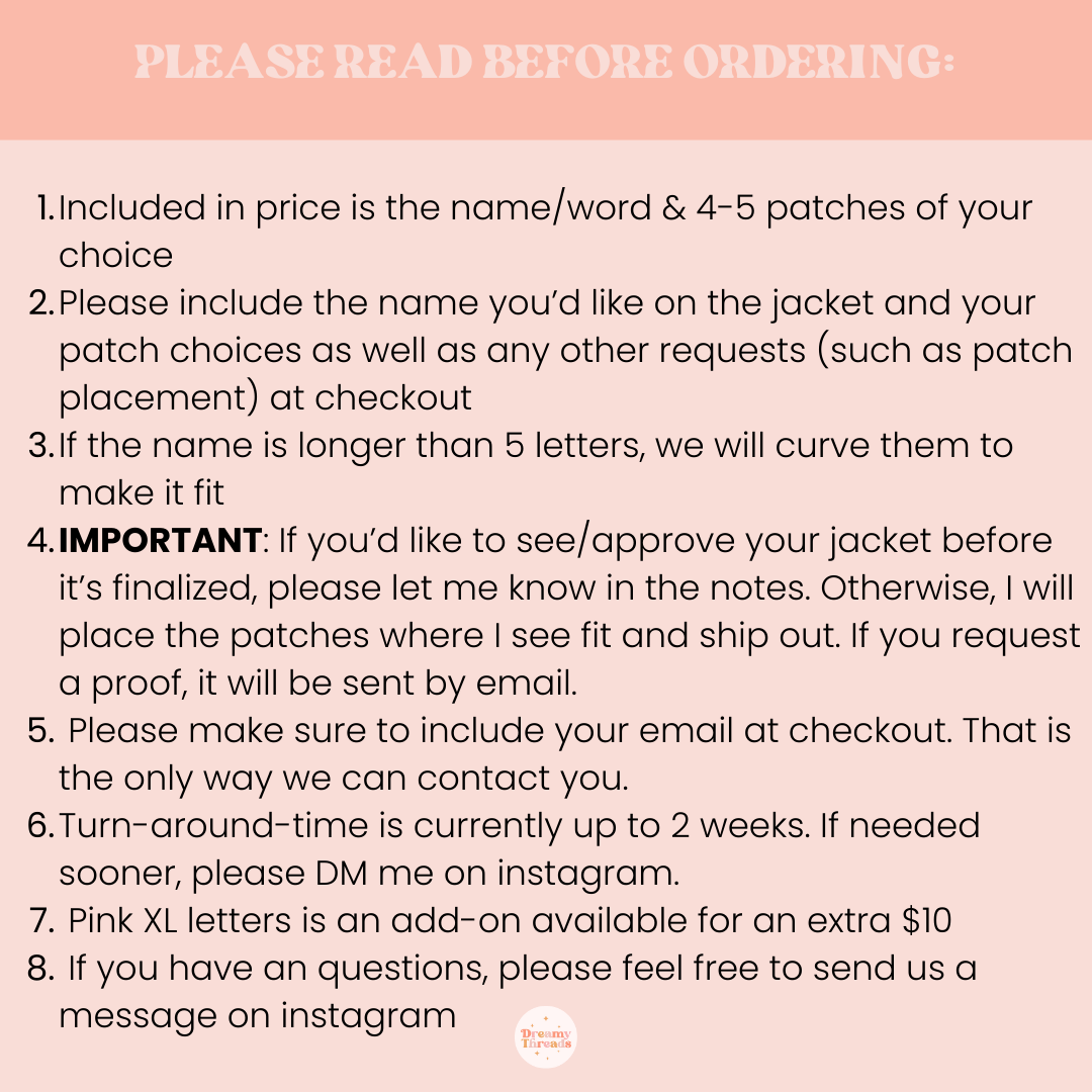 For the name/word you want on the jacket, please specify in the notes section at checkout. You can choose from a variety of colors for the letters, including light pink, white, purple, teal, black, and dark pink. In addition to the customizable name, you can also choose up to five patches to add to your jacket.