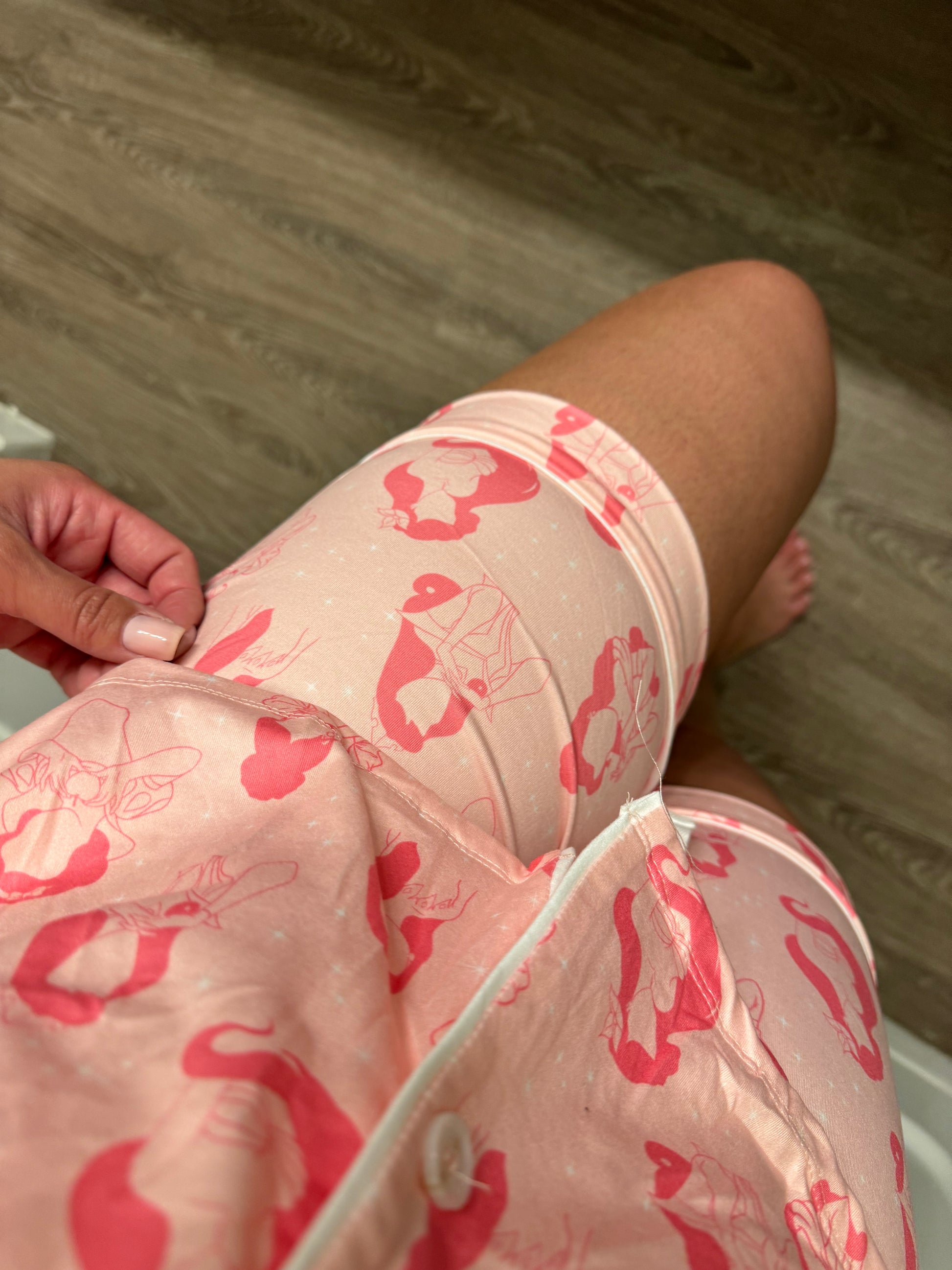 Featuring a button-down top and drawstring shorts, these pajamas blend practicality with charm, ensuring a perfect fit every time. We recommend customers to order their true size to experience the ultimate comfort.