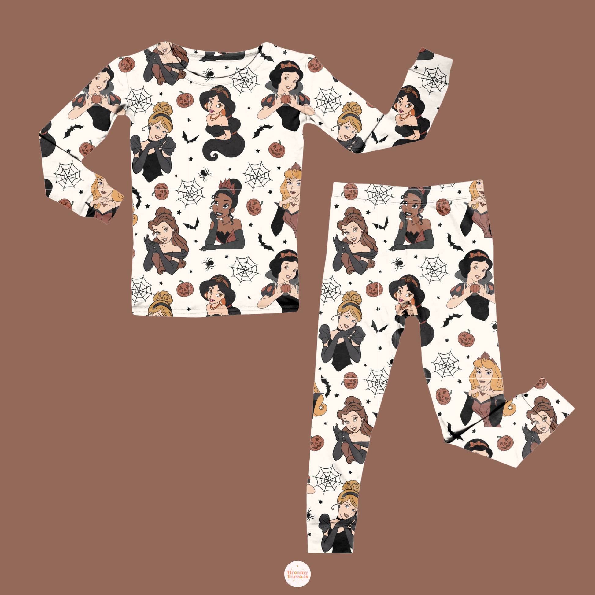 Bring a little magic (and a little spook!) to your Halloween season with our Spooky Princess Pajamas! Featuring a charming all-over print of your favorite princesses dressed in bewitching black and orange with pumpkins, spiderwebs, and bats for that perfect festive touch.