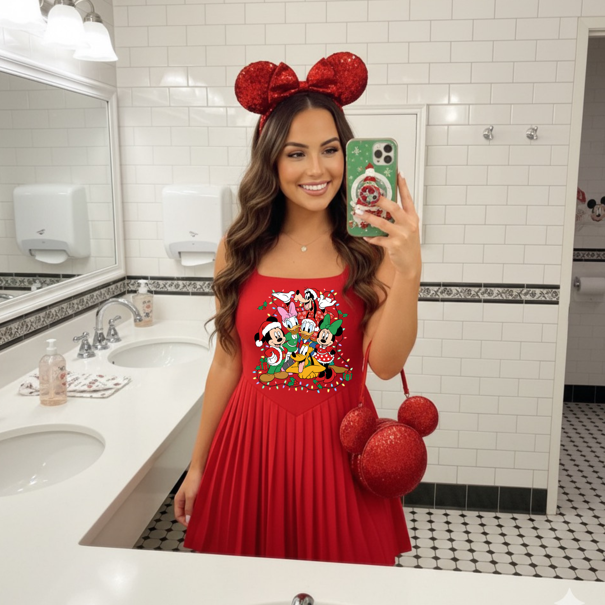 Celebrate the holidays in style with this adorable red pleated dress featuring your favorite classic cartoon friends in a festive Christmas design! Made for adults, this charming dress combines playful nostalgia with modern comfort.