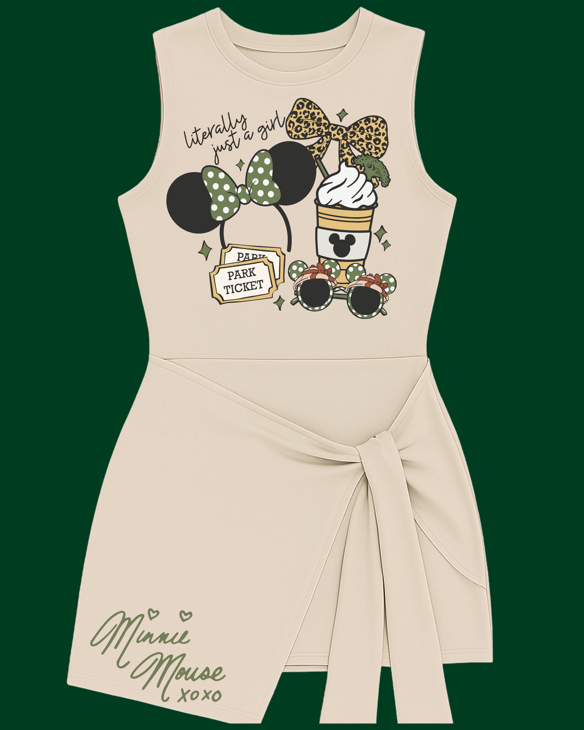 Literally just a girl… who loves the parks 🤍✨ This brand new sleeveless wrap tie dress is the cutest + comfiest way to bring your Disney magic into your everyday style. Featuring a neutral beige tone with a modern twist– and the sweetest Minnie inspired graphics in greens + cheetah print accents. Perfect for park days, coffee runs, resort hopping, or just living your best magical girl era.